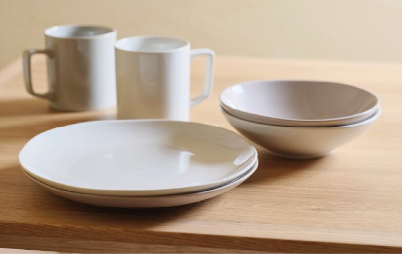 「resta」は、粉砕した食器をリサイクル原料として使用した環境に優しい食器です。ご滞在中のくつろぎのひとときに、ご自由にお使いください。
