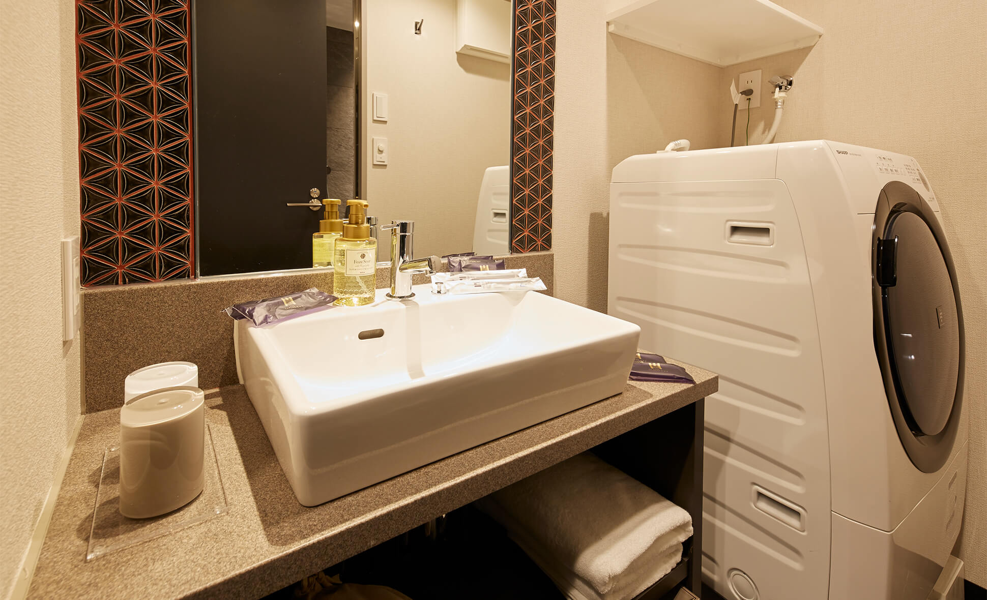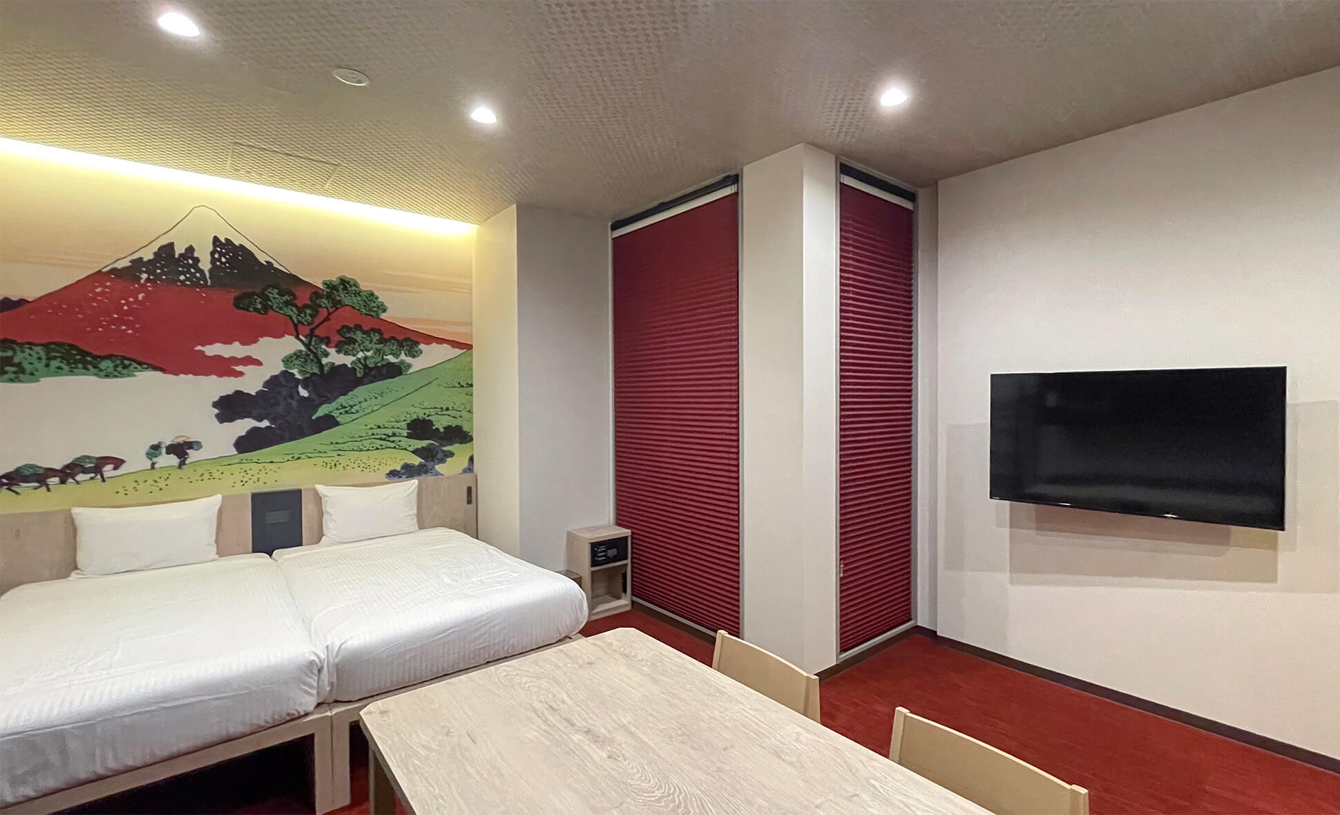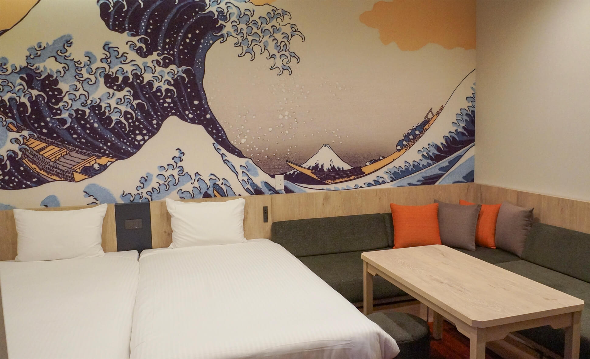 The wallpaper in the rooms features famous Japanese statues and portraits in an American comic book style for guests to enjoy. Original hand towels and eco bags are also included as gifts!