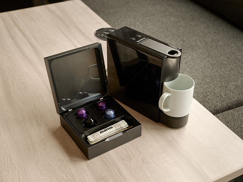 お部屋で濃厚なエスプレッソ抽出のコーヒーをお楽しみいただけます。デカフェもご用意しております。