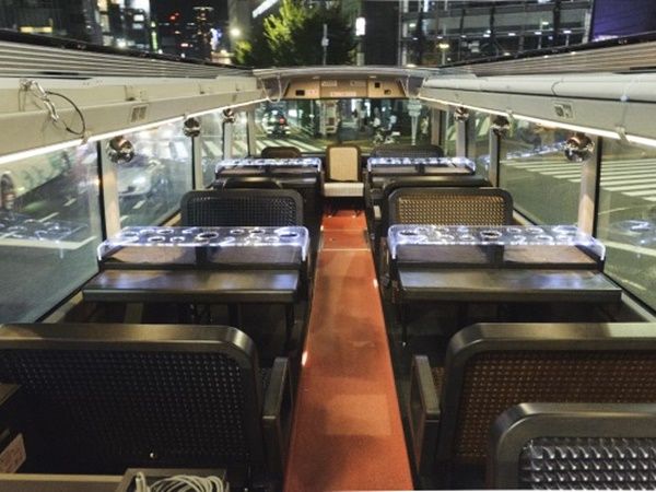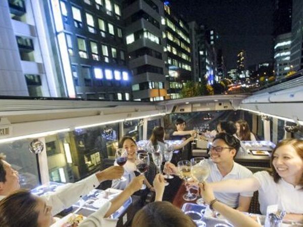 オープンルーフのレストランバスで、高層ビル群やレインボーブリッジを眺めながら、シェフこだわりのモダンな和食ディナーをお楽しみいただけます。