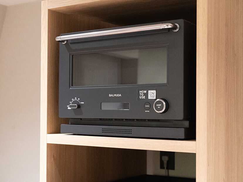 電子レンジは『BALMUDA』社製です。大人気のアイテムをぜひご体感ください。
