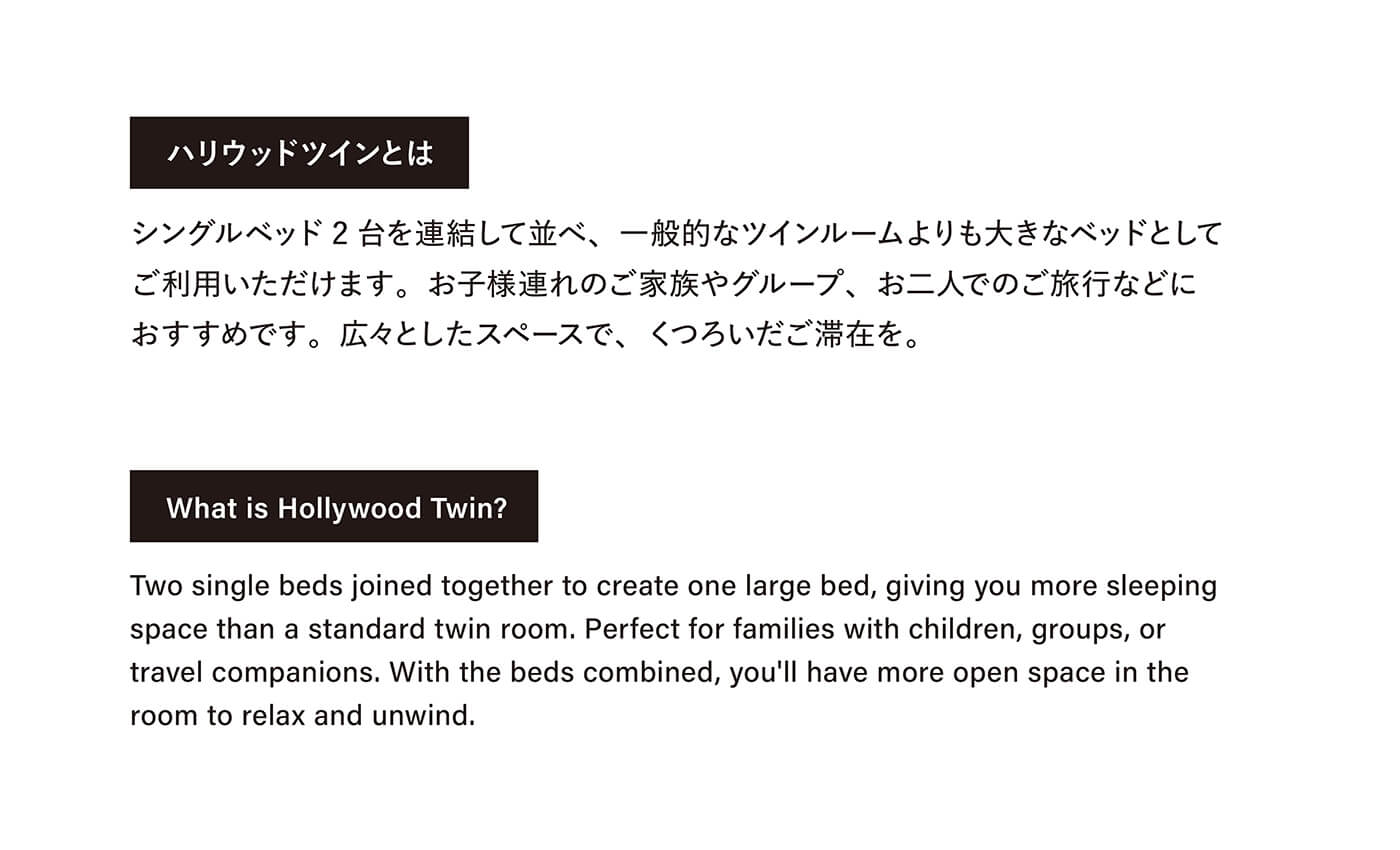 ベッドを2台連結し、広々と利用できる客室タイプ。
